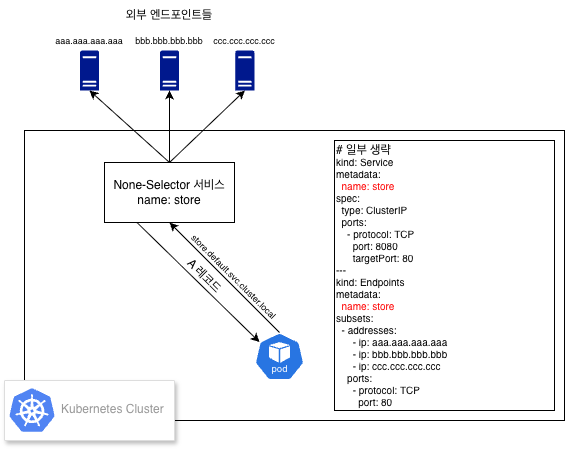 None-Selector 서비스는 ClusterIP 서비스의 일종으로(일반적으로 클러스터 내부에서는 ClusterIP 서비스를 통해 로드 밸런싱을 하기 때문에 이를 기준으로 설명한다.), 말 그대로 ClusterIP 서비스의 selector 를 지정하지 않는 대신, Service와 동일한 이름의 Endpoints 를 생성하고 Endpoints 에 subsets[].address[] 를 배열로 지정하여 Service와 목적지를 1:N 으로 매핑하도록 구성해준다.(로드 밸런싱 포함) Endpoints 에서 지정하는 로드 밸런싱 대상 멤버에는 외부 서비스의 IP 들을 지정하면 된다. Endpoints 에 지정된 엔드포인트들을 타켓으로 해야 하기 때문에 당연히 spec.externalName 도 지정하면 안된다.