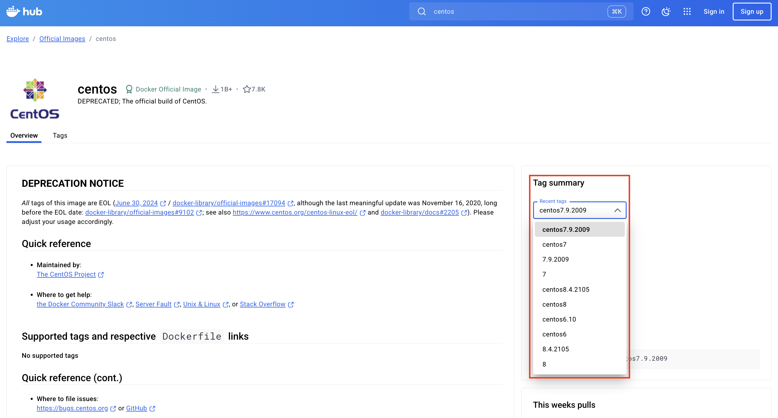 docker hub 웹사이트에서 원하는 이미지를 찾아 들어가면 Tag summary 에서 인기있는 주요 태그들을 볼 수있다.(권장하는 태그들)